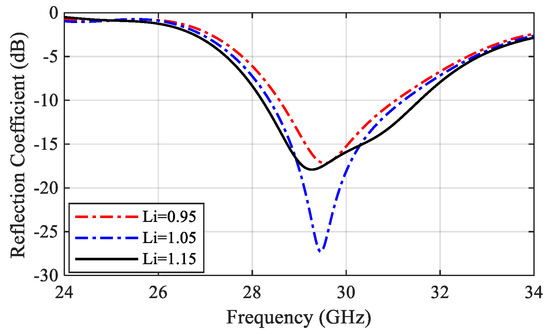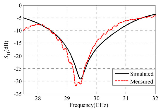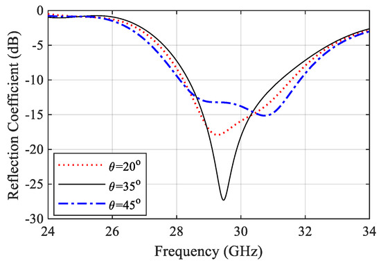 Referred to the designed power splitter in Section 2.1, the DA elements were connected to the power splitter output ports. The final antenna array configuration is presented in Figure 4. The impedance matching performance of the antenna array is mainly influenced by the length of the GCPW transformers between the SIC and the microstrip line and the radiating dipole corner angle . To demonstrate the effect of these parameters, a parametric sweep was carried out, as shown in Figure 5 and Figure 6. The antenna impedance matching is obviously affected by both angle and length , showing the best matching from 28.5 GHz to 31.5 GHz. The optimum antenna dimensions are listed in Table 1.
