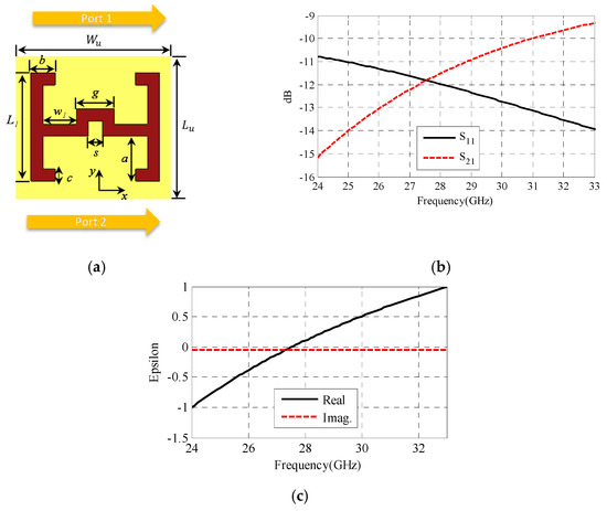 ENZ metamaterial unit cell and results. (a) Geometry of the unit cell. (b) S−parameters of the unit cell versus frequency. (c) Real and imaginary unit cell permittivity versus frequency.
