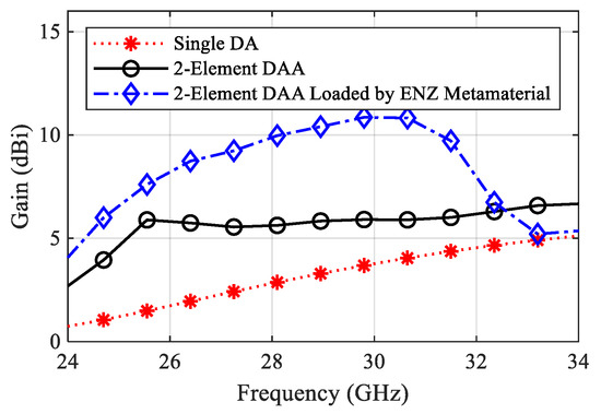 The other method for gain improvement is the utilization of metamaterials. Metamaterials have a conspicuous interest due to their phenomenal electromagnetic properties, which do not exist in common materials, like double negative (DNG) refractive index metamaterials [12], mu-near-zero metamaterials (MNZ) [13], and epsilon-near-zero (ENZ) metamaterials [14]. In an ENZ metamaterial, the phase velocity of a plane wave tends to infinity resulting in wavelengths tending to infinity, which means no phase variations in such material. So, if a radiator is implanted into an ideal ENZ metamaterial, the beams emerging from distinct points of the ENZ surface are in phase. This property enables the ENZ metamaterial to be an excellent candidate for antenna radiation enhancement [14]. Three pairs of metamaterial arrays were utilized to improve the gain of the dual-beam end-fire bowtie antenna to 7.4 dBi at 26 GHz [15]. A modified AVA with metamaterial and corrugation enhanced the gain from 5 to 9.53 dBi over 24.77 to 34.52 GHz [16]. However, the antenna array leads to large sizes, while the ENZ metamaterial technique leads unsatisfactory gain.