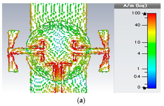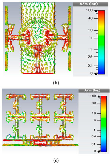 The suggested ENZ metamaterial lattice is used to enhance the broadside gain and to reduce the cross-section radiation of the proposed antenna. The bandwidth of the antenna is not affected so much by the presence of the ENZ unit cells, and the reflection coefficient shows very good matching across the bandwidth starting from 28.5 GHz to 30.5 GHz, as shown in Figure 9. The gain comparison for all update steps is demonstrated in Figure 10. The effect of the ENZ metamaterial is significant on the antenna gain over the whole bandwidth. The average gain is improved to 10.17 dBi, and the peak gain jumps to 11 dBi at 30 GHz. In other words, a 50% gain enhancement is achieved compared with the case of no ENZ unit cells. For further interpretation, the surface current distribution is illustrated in Figure 11. It is clear that the surface currents without ENZ unit cells are symmetrically distributed in the same direction on the array elements, which increases the radiation in the broadside direction and decreases it in the cross direction. After employing the ENZ metamaterial unit cells, the current is induced to the unit cells and distributed symmetrically, as shown in Figure 11b,c contributing to the traveling of the electromagnetic field uniformly along the z-direction, which improves the antenna gain.