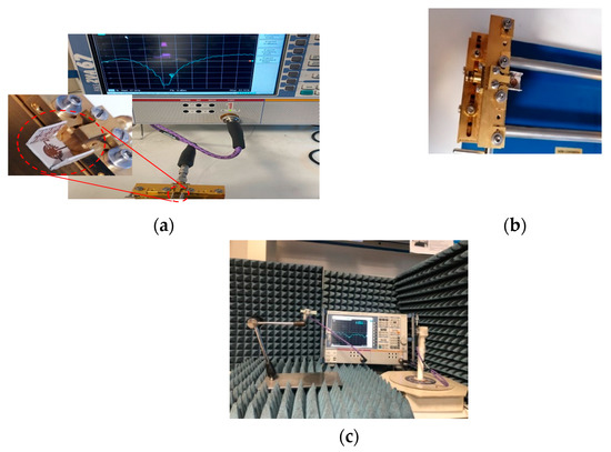 Fabricated antenna prototype. (a) Measurement setup of scattering parameters (b) Photo of the proposed antenna connected to the test fixture (c) Measurement setup of radiation patterns.