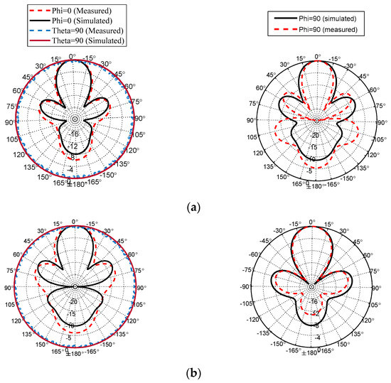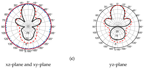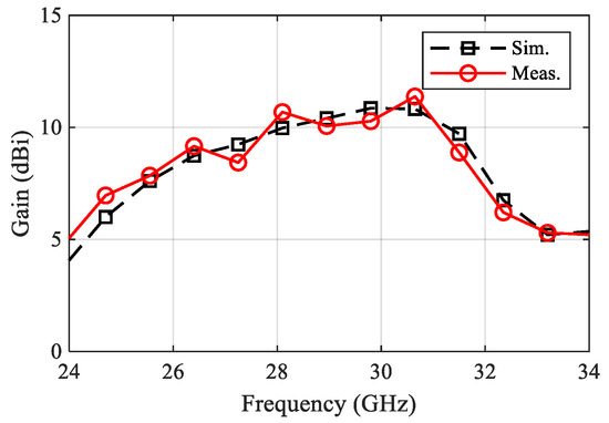 A fabricated prototype of the proposed antenna is illustrated in Figure 12. An adhesive material was used to support the ENZ substrate to simplify the assembling stage. Testing was carried out by Vector Network Analyzer ZVA and a universal substrate test fixture of model number WK-3001 as shown in Figure 12b. The radiation pattern measurement setup is presented in Figure 12c. An mm-wave standard horn antenna was utilized as a transmitter, while the proposed antenna represented the receiver side. The distance between the transmitter and receiver antennas was kept to be more than one wavelength. To achieve accurate gain measurements, both antennas should be illuminated by a uniform plane wave. This means that a region free from reflections and unwanted signals should be considered. In practice, mm-wave absorbing materials were placed around the measurement system to eliminate any undesired interference. As shown in Figure 13, the input impedance is well-matched over the desired frequency band. However, the measured input impedance bandwidth is slightly narrower than the simulated one. The simulated impedance bandwidth starts from 28.5 GHz to 30.7 GHz, while the measured one ranges from 28.5 GHz to 30.5 GHz. The small difference between the measured and simulated reflection coefficient may be attributed to several factors including fabrication tolerance and effect of test fixture, which was not taken into account during the simulation process. The antenna radiation characteristics were measured using the gain-transfer method [31], showing a maximum gain of 11 dBi at 29.5 GHz with good agreement between measured and simulated curves, as shown in Figure 14. Figure 15 gives antenna radiation patterns in the three xz, xy, and yz planes at 28.5 GHz, 29.5 GHz, and 30.5 GHz, respectively. The measured results show some discrepancies due to fabrication tolerance and existence of the VNA and the metallic antenna holders inside the chamber. However, the measured and simulated results show quasi-broadside distribution. Generally, these measured results confirm the ability of the proposed structure to be a good candidate for mm-wave 5G applications. To show the advantage of the proposed antenna over the similar state-of-the-art work, Table 3 presents a comparison in terms of size and gain. It is clear that the proposed antenna has a distinctively high gain for a relatively compact size. Although the authors of [15,19,24] used smaller sizes, their designs suffer from either lower gain or complex structure.