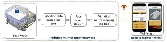 Figure 1 shows an overview of the AI-enabled PdM framework for an autonomous cleaning robots platform. It uses vibration signals to predict cleaning robot performance degradation and any hazardous operational environment. The overview of the framework is explained as follows. This involves the robot platform details used for tests, the vibration data acquisition unit, the four-layer 1D CNN algorithm, the vibration source mapping module, and the remote monitoring unit.