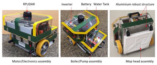 An in-house autonomous steam mopping robot (Snail) designed for cleaning and disinfection of indoor floors is used in this case study, as shown in Figure 2. The overall size of the robot is 40 × 40 × 38 cm, and the total weight is 18 Kg, including inverter, battery, steam boiler, and mop head assembly. An NVIDIA Jetson AGX single-board computer is used to steer the entire operation of the robot, including autonomous navigation, executing predictive maintenance framework, and controlling all other sensors. In addition, the RPLIDAR A2 scanner is used for localization and mapping of the environment, and the Inertial Measurement Unit (IMU) Vectornav VN-100 sensor is used to estimate the motion, orientation, and heading angles of the robot. The robot locomotion was accomplished by a differential wheel drive mechanism with two supporting caster wheels. A D-Link 4G/LTE mobile router is used to control the robot remotely and monitor the robot’s health.