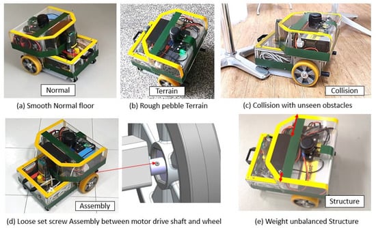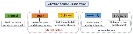 In our study, five vibration classes are used as critical indicators for mobile cleaning robots’ performance degradation and operational safety issues. It is classified under three categories: normal, external factors, and internal factors, as shown in Figure 3. Here, terrain and collision-induced vibration belong to external factors, while assembly and structure-induced vibrations are due to internal factors.