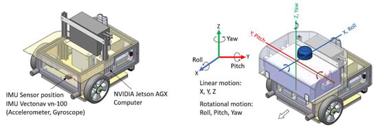 The linear and angular motion of the robot will be affected due to internal or external causes of vibration. Hence, we measured the linear acceleration (X, Y, and Z-axis) and angular velocity (roll, pitch, and yaw) of the robot using the onboard IMU sensor (Vectornav VN-100), which reflects the vibration level of the robot. Our IMU data subscription includes angular acceleration calculated from each instance’s current and previous angular velocity. Hence, the robot measures three signal data (linear acceleration, angular velocity, and angular acceleration) in three axes. This total of nine-sensor data collected during the exposure of five vibration source classes was used as the vibration signal data (feature values). The IMU subscription rate was set at 40 Hz, and each sample is grouped into 128 (time steps) data elements, which is every 3.2 s. The collected data is converted into a three-dimensional input array comprising samples, time steps, and features values. Figure 4 shows the data acquisition unit details, mainly the sensor position on the chassis at the center of the differential wheel drive axis.