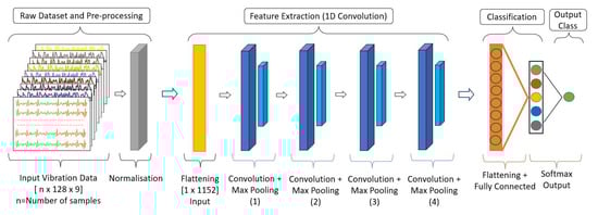Figure 5 shows the structure of the predictive maintenance 1D CNN framework. It involves mainly an input layer, four convolutional layers, a Fully Connected (FC) layer, and an output layer. The raw sensor data of the 3D array [n × 128 × 9] gets normalised first. Then each sample is flattened to a 1D array [1 × 1152] for feeding into the CNN. The first two CNN layers use 64 filters and follow kernel size (convolution window) 3. The following two CNN layers use 32 filters and apply the same kernel size. A Rectified Linear Activation Unit (ReLU) is applied to each convolutional layer to learn complex nonlinear patterns in the signal data. After each convolutional layer, max pooling with a stride size of 2 and a dropout layer (dropout rate 0.2) is applied to reduce the feature map dimension and avoid over-fitting. Finally, a flattening function is used to convert the pooled feature map into a 1D array and pass it into the FC layer. A softmax layer is added as the final activation function in the output layer that predicts the multinomial probability. The output layer contains five neurons for the five vibration classes. Table 1 shows the details of the 1D CNN architecture.