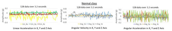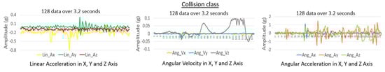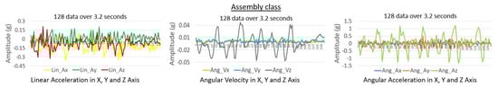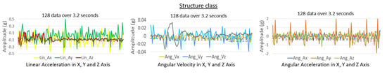 The Figure 7, Figure 8, Figure 9, Figure 10 and Figure 11 shows the time-amplitude graph for the vibration signals raw data collected for all the five classes across each signal type (linear acceleration, angular velocity, angular acceleration) and its three-axis. The graphs provide a visual representation of how the signals vary through different vibration source classes. It is plotted for one sample (128 data), i.e., captured in 3.2 s.
