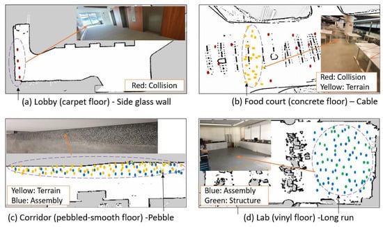 The first case study was trialed in a lobby environment consisting of a glass sidewall and carpet floor. Here, collision-induced vibrations were registered in the cartographer SLAM algorithm-generated map due to incorrect mapping of the glass wall. The glass wall was covered with a raising curtain in the original map during the mapping time, whereas it was removed while testing. As a result, the robot lost the previously mapped navigation awareness, and RPLidar could not locate the glass as an obstacle. The robot hit on the glass randomly, and the repeated collision-induced vibration marks were captured in the lobby environment 2D map as shown in Figure 12a.
