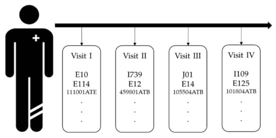 Converting complex, irregular, and sequential EHRs into the appropriate form is the first step in the health-related research by patient data representation. Due to insufficient domain knowledge, statistics are often used to evaluate patient information. For example, the frequency-inverse document frequency (TF-IDF) method can evaluate the importance of clinical concepts in medical records. The importance of the concept increases proportionally with the number of times it occurs in the patient’s medical records, but at the same time decreases, as opposed to the frequency it occurs in other patients’ medical records. Reference [] used a vector consisting of the international classification of diseases (ICD)-10 codes to represent individual patients, and assigned weights to ICD-10 codes using the TF-IDF method. References [,] features were extracted from diagnostic codes, drug components, and lab tests with TF-IDF methods, and similarity was measured using Euclidean distances. However, the above studies did not take into account the sequential properties of obtaining the patient presentation. With the development of deep learning, which is good at longitudinal data processing, several studies have conducted patient presentations using neural networks. Reference [] used auto-encoder as a deep learning framework for the patient representation. References [,] established a vector representation for medical concepts from longitudinal EHRs, and a vector representation of each visit is obtained from the sum of the vectors of medical concepts arising from that visit. This vector representation also considers two levels of embeddings: the medical concept level and the visit level. Not only does this work enhance the effectiveness of the prediction task, but it is also meant to apply the learned interpretable representation to other problems. Reference [] proposes a model that uses a new time-aware long short-term memory (LSTM) module to process irregularly spaced longitudinal EHRs and obtain effective patient representation by capturing independencies in the sequence.