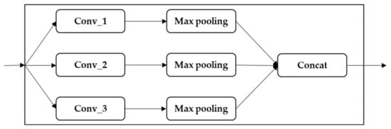 In each CNN block, as shown in Figure 2, three convolutional operations and pooling operations are performed on the input feature map in a parallel manner. All of the output is joined into a relative deep feature map. Because different convolution operations and pooling operations can obtain additional information of the input feature map, parallel, conducting these operations, and combining all the outputs, will get better feature representation. The different convolutional layers aim to extract various features, and max-pooling layers are used to reduce the intermediate representation. Then, the feature maps derived from different branches are concatenated together as a feature map for the following step processing.
