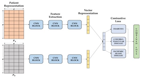 Recently, studies have been conducted to learn patient similarity measurements and obtain patient presentation considering the temporal properties of longitudinal EHRs. Reference [] represented the longitudinal EHRs of each patient by a matrix constructed by stacking equal-length embedded vector representations of each visit as the input to the network, which preserves the expression of the temporal characteristics of the longitudinal data. Based on the structure composed of bi-directional convolutional neural networks (CNN) and supervised metric learning, a matching matrix is used to calculate the similarity between the two embedded vectors derived from the deep network. Reference [] proposed a time-fusion CNN framework that preserves the local temporal relationship and obtains a global contribution of different time intervals for patient similarity measurement. The work also made predictions for target patients according to the phenotype of the k-nearest patients. Reference [] proposed a CNN-based triple patient similarity learning framework to learn a margin that separates similar and dissimilar patients better.