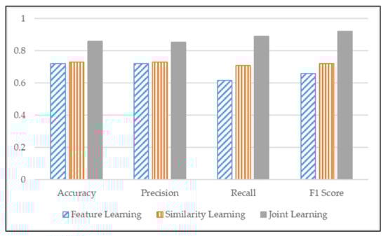 This section compares the performance of three different learning approaches: feature learning, similarity-based learning, and joint learning by classification evaluation metrics. In feature learning, we follow the procedure of base CNN network training as a categorization classifier. Similarity-based learning is a model that removes the categorization classifier. Finally, joint learning is a method of combining the two models. Since we transform the similarity learning problem into a supervised binary classification problem, we compare the proposed model with feature learning and similarity learning performance in binary classification tasks. We selected accuracy, precision, recall, and F1 scores as performance metrics from classification evaluation. Classification metrics are calculated from true positives, false positives, false negatives, and true negatives. Accuracy is one metric, which gives the fraction of predictions our model got right. Precision gives the fraction of correctly identified as positive out of all predicted as positives. Recall gives the fraction that correctly identified as positive out of all positives. Lastly, the F1 score is the harmonic mean of the model’s precision and recall because it is not sensitive to extremely large values, unlike simple average []. The results are shown in Figure 6.
