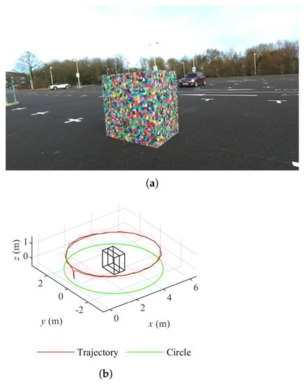 We have introduced the data sets collected with a controlled procedure in [22]. Boxes with either a plain cardboard texture or Voronoi diagrams [28] are the targets to be explored. With a pair of boxes, five layouts can be created with the free tetrominoes in the Teris game [29,30], i.e., I, O, T, L and S. Data sets are collected in two environments, in front of buildings and in a parking lot, with a ZED stereo camera (Stereo Labs, USA) moving along the circle on the ground and orbiting the targets twice. The resolution of a single image is HD (1280 × 720 pixels). The number of data sets is 20 considering textures, layouts and environments. Figure 1a shows one example of 20 data sets, O tetromino layout boxes with the Voronoi pattern in the parking lot. The corresponding camera trajectory for data collection is presented in Figure 1b.
