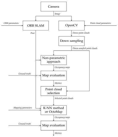Figure 2 shows the experimental method for comparing two mapping methods. As explained in [22], the StereoSGBM algorithm [21] in OpenCV is implemented on the images of the keyframes derived by ORB-SLAM [31] to generate disparity maps, from which point clouds can be reconstructed with a stereo camera model. These point clouds are then downsampled with the Voxel filter in the PCL [7]. The resolution of the Voxel filter is set to . With time stamps, each point cloud can match with the keyframe pose generated by ORB-SLAM. The resolution of occupancy maps and maximum range for how long individual beams are inserted are set to and 4 , which has been discussed in [22].