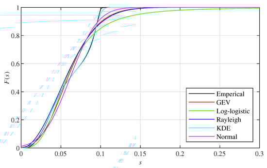 We first show the results of the average distance fitted by different distributions, i.e., GEV distribution, log-logistic distribution, Rayleigh distribution, KDE and normal distribution. An example is given by the average distance derived by the 800th point cloud set of I layout Voronoi boxes in front of buildings. The corresponding CDF is presented in Figure 3. Results show that the CDF of the average distance is nonsensitive to the types of distribution. Results from other point cloud sets also show a similar conclusion.