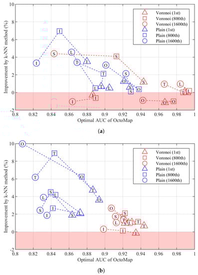Improvement by the k–Nearest Neighbours (k–NN) method over the optimal area under the curve (AUC) of OctoMap. (a) Building. (b) Parking lot.