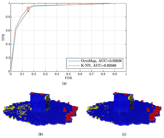 Figure 6 shows an example of the occupancy maps derived by OctoMap and the k-NN method. The TPR–FDR curves of the two mapping algorithms are presented in Figure 6a, corresponding to the improvement using the first point cloud set of the data set of the O tetromino layout of Voronoi boxes in the parking lot in Figure 5. We pick up two points of similar FDR on the two curves, and corresponding maps are shown in Figure 6b,c.