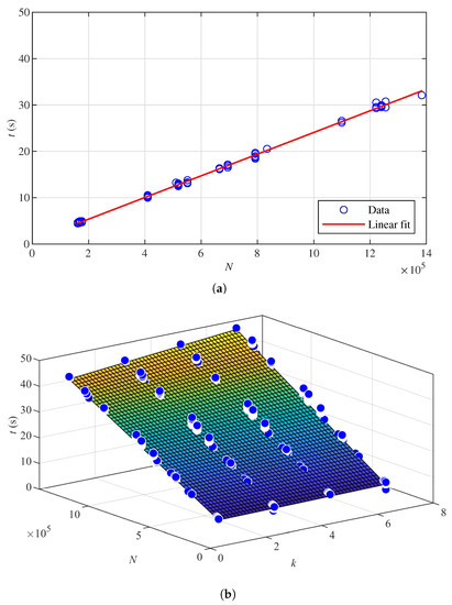 Finally, the time model in Section 3.6 is verified. Here, the point cloud parameters are the same as those used for k-NN parameter reduction, introduced in Section 4.3. Figure 7a presents the linear fit for the run time of OctoMap. Corresponding coefficients in (17) are and . Then, 5% of the parameter reduction results with the aforesaid point cloud parameters in [22] are randomly selected to plot Figure 7a. The result shows that the run time is proportional to the number of points processed by the OctoMap algorithm. Figure 7b verifies the time estimation model (18). In each data set, 5% of the k-NN parameter reduction results are randomly selected to estimate the time model. The coefficients in the model are , and . The result shows that run time increases with parameter k and the number of points processed.