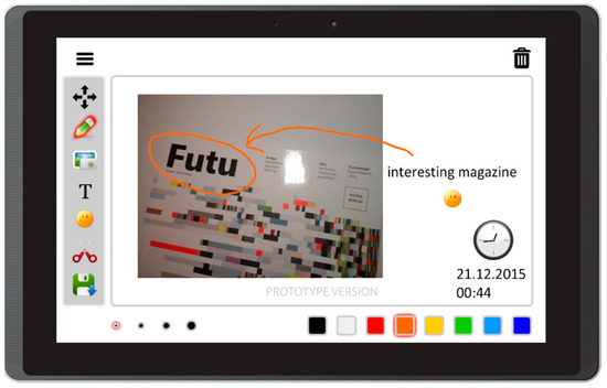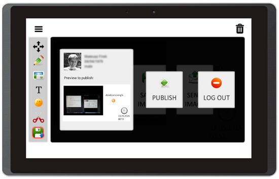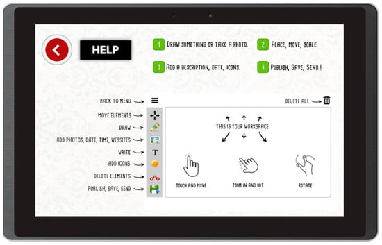 Typical applications for aphasia are designed to be used as rehabilitation tools aimed at regaining language skills, whereas our apps are designed to help in communication through storytelling. Our conversations with caregivers and patients showed that the mainstream storytelling applications are not tailored to the specific needs of older people with aphasia, as these apps lack important functionalities, and are too complicated for such users. Our research also results from the literature on the subject. The disadvantages of the aforementioned applications—such as Day One, Five Minute Journal App, etc.—are as follows: multiscreen and multilayer interfaces; no possibility to create mood boards with various objects, such as photos, icons, text, clocks, and dates; no possibility to draw on photos; no icons or emoticons to label emotions; a large amount of small text in the user interface; very closely spaced icons close to the edges; a difficult-to-understand process of creating entries, with too many elements at once; etc. Considering applications on Google Glass, such as Memoirs or Glossaic, they do not offer the possibility to create stories from sequences of photos and videos, and they do not have the option of describing photos with icons or text.