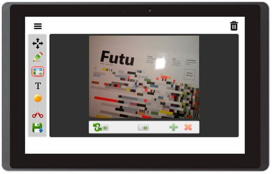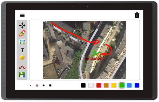 Figure 8. Adding text, emoticons, and time stamps in Aphasia Create (screenshot from an Android tablet). - Accessing maps with geolocation—the application is integrated with OS maps, so the users may quickly check their position, and can also take a screenshot to put it on the canvas (Figure 9);