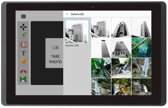 Figure 4. Taking photos with the front and back camera in Aphasia Create (screenshot from an Android tablet). - Accessing camera memory for loading and saving images—this feature allows the creation of visual messages, constructed based on previously taken photos (Figure 5). The user can save created images to the camera memory for future reuse or sharing;