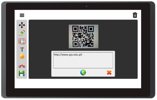 Figure 6. Reading QR codes for opening websites in Aphasia Create (screenshot from an Android tablet). - Accessing websites in a web browser—since the app is integrated with a web browser, the user does not have to open an external application. This also enables taking screenshots of interesting webpages and using them to build a visual message (Figure 7);