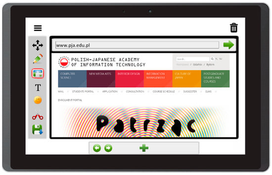 Figure 7. Accessing websites in a web browser in Aphasia Create (screenshot from an Android tablet). - Adding text, emoticons, and time stamps—the user can add text. All operating system (OS) features are available, including spell checking and speech synthesis. Patients who have retained their writing ability can enter text using the keyboard and put it on the canvas. The user can also add emoticons, commonly used for expressing emotions about their experiences. Additionally, since some patients have problems with remembering events and places, adding time stamps (current date and time) can help them to organize events on the timeline and recall them later (Figure 8);