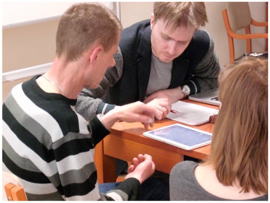 Before the applications were tested for usability, the Aphasia Create app was pre-evaluated by carers and target users; it was introduced to 10 persons with aphasia to get their first impressions, with the help of an aphasia association based in Poznań, Poland [35]. Users were familiarized with the application and encouraged to ask questions while performing simple tasks. The purpose of this preliminary study was to find out what information the users were missing and what feelings their first contact with the application on the tablet raised. It was also important to check how to formulate tasks and questions in conversation with people with aphasia during future usability tests. In particular, this influenced the form of asking questions in the final phase of the satisfaction survey. People with aphasia have difficulty understanding sentences of complex structure. Therefore, it is best to get feedback by making a simple statement and asking to what extent the person agrees or disagrees with it. Figure 12 shows a meeting with one of the respondents and a conversation about the application.