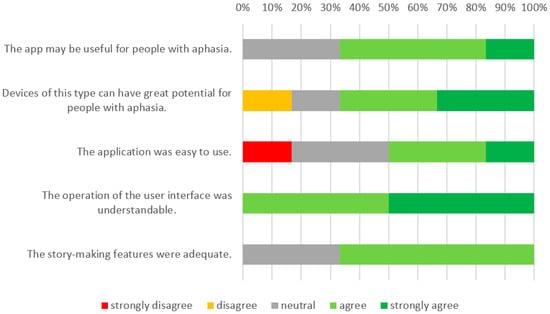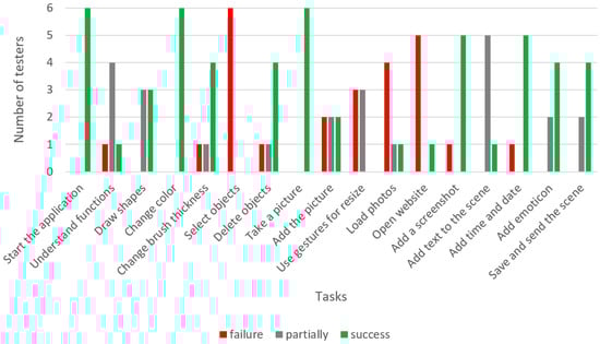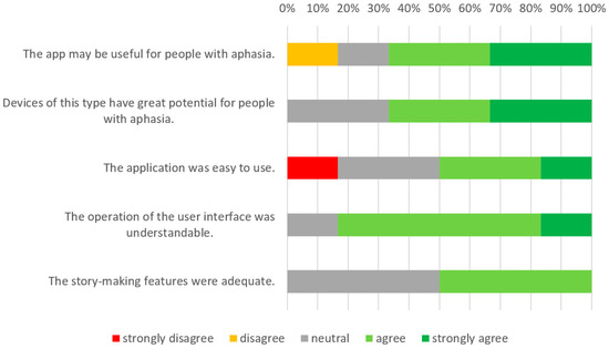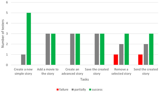 The users also reported problems with feedback within the application. Specifically, they had doubts as to whether an action was performed correctly in the application. They reported the need to display messages confirming whether their commands were performed (e.g., the picture or video or story was saved). The usability test results of the Aphastory application are presented in Table 3 and Figure 15.
