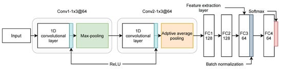 At this stage, the main objective is to learn meaningful representations from the raw data, which helps maximize the overall framework’s recognition accuracy. After the learning phase using the CNN model, the feature selection algorithm is used to filter the extracted features by selecting the most important features only that maximize the classification accuracy. The CNNs are characterized by a core ability that shares weights between multiple layers to minimize the model complexity [49]. The proposed CNN architecture is illustrated in Figure 2, and it is composed of the following layers: (2) Convolutional layers (Conv), (2) Pooling layers, and (4) Fully connected layers (FC). The full network can be summarized as where: (1) Conv1 is the first convolutional layer with 64 filters, kernel of size 3, stride of size 1. Conv1 uses the rectified linear unit (ReLU) [50] as a non-linear function followed by a dropout regularization with a rate equal to 0.5 and a max-pooling operation of size 2, (2) Conv2 is the second convolutional layer similar to Conv1 with the only difference is the usage of an adaptive average pooling layer [51] instead of max-pooling, (3) FC1, FC2, and FC3 are fully connected layer having 128, 128 and 64 neurons, respectively. FC1, FC2, and FC3 are used as feature extraction layers to output the learned features from the raw input, (4) BN stands for batch normalization operation, and (4) FC4 is the final FC layer to output the classification predictions.