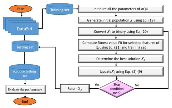 The presented AQU begins by splitting the tested benchmark data into 80% and 20% training and testing sets, respectively. The beginning population X that consists of N solutions is formed using Equation (19).