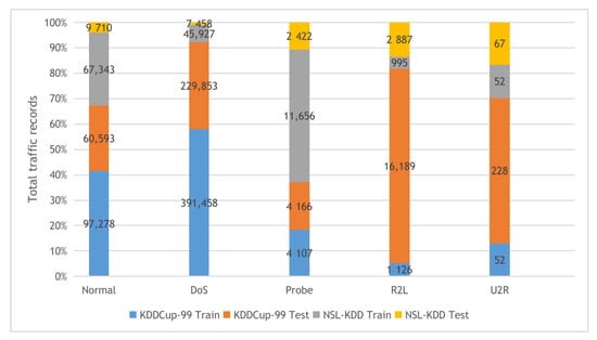 Figure 4. The KDDCup-99 and NSL-KDD datasets training and testing sets distribution. - BoT-IoT: the Bot-IoT dataset [60] was collected in The center of UNSW Canberra Cyber using smart home appliances in a laboratory environment (the Cyber Range Lab). The dataset contains Industrial IoT (IIoT) traffic samples collected for IIoT experiments. The smart home appliances include weather monitoring systems, thermostats, kitchen appliances, and freezers and motion-controlled lights to record the traffic data. In our experiments, we used the 5% of the full Bot-IoT dataset, which consists of 3.6 million records, where the full dataset contains over 72 million records. The 5% of the entire dataset contains the best ten features extracted from the raw data and categorized into five main classes as described in Figure 5.