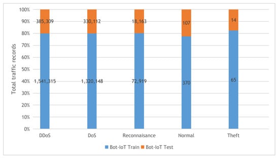 Figure 5. The Bot-IoT dataset training and testing sets distribution. - CICIDS-2017: The CICIDS-2017 [61] dataset is a collection of network traffic samples collected in CIC (The Canadian Institute for Cybersecurity at the University of New Brunswick.) for the intrusion detection task. The dataset consists of more than 1.5M PCAPs data simulating traffic data transferred in real-world using the CICFlowMeter software after analyzing 25 user behaviors covering various network protocols such as HTTP and SSH protocols. The collected data were categorized into eight main attack classes as described in Figure 6. Our experiments used the following collected CSV files: Tuesday-working hours, Friday-WorkingHours-Afternoon-PortScan, Friday-WorkingHours-Afternoon-DDos, and Thursday-WorkingHours-Morning-WebAttacks.
