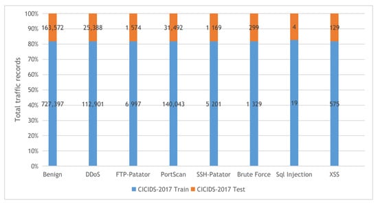 Figure 6. The CICIDS-2017 dataset training and testing sets distribution.