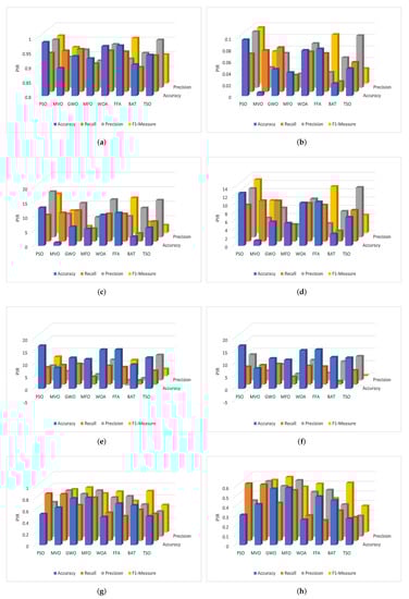 For the binary case of Bot-IoT, the AQU has better results in both the training and testing sets. Moreover, the of the proposed AQU method and other optimization approaches is depicted in Figure 7a,b. For multi-classification variants, PIR ranges from 2.56 to 7.354 based on the value of accuracy, where it ranges from 1.080 to 4.410 based on the values of recall. Precision and F-measure range from 1.255 to 5.359 and 0.886 to 4.693, respectively. In binary classification case, the ranges are 2.496 to 0.0946, 0.941 to 4.210, 1.450 to 5.271, and 0.546 to 2.759, respectively.