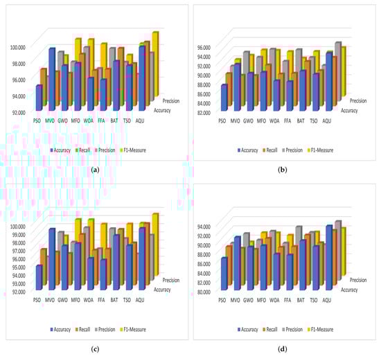 Also, Table 2 and Figure 7c,d show the comparison results between the AQU and the compared algorithms using the NSL-KDD dataset; These results demonstrate the high performance of the proposed AQU over all compared approaches for both multi and binary classifications. As can be shown from performance measurements and the testing set results, the developed AQU behaves better in the learning phase than compared approaches. Furthermore, the developed AQU outperforms MVO with a difference of about 1.024%, and outperforms PSO with a difference of approximately 13.039%. The developed AQU outperforms existing models according to the value of recall, precision, and F-measure, with differences ranging from 2.75%, 6.85%, and 2.310% to 10.61%, 15.67%, 13.49% respectively.