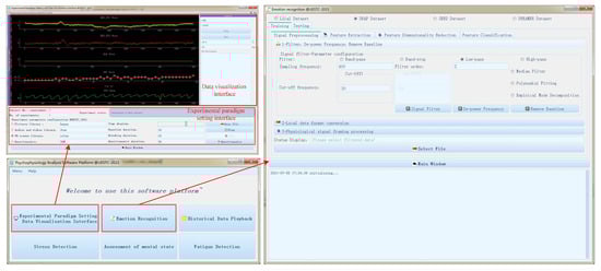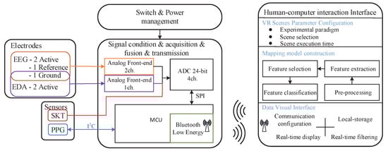With the development of wearable physiological detection, bio-signals sensors can already be built into terminals such as clothes, hats, shoes, gloves, beds and game handles for long-term users’ emotional perception and feedback. The Empatica company launched E4 smart watch to collect data for affective computing researchers []. This watch can collect EDA, PPG and SKT at the wrist, and can also calculate pulse rate (PR) through PPG signal. The reference [] embedded dry electrodes EEG sensor and two eye-tracking cameras in the HTC Vive headset. It can synchronously record muli-channel EEG signals and eye movement image. Moreover, the authors of [] provided an emotion recognition interface for predicting users’ evaluations of attractiveness. While there are two disadvantages in the system, one is that it cannot acquire other peripheral bio-signals which is vital for emotion recognition. The other is that the EEG sensors module cannot be equipped with other VR or AR HMD on the market. A single dry-electrode wearable device NeuroSky MindWave was applied to collect prefrontal EEG signal to connect personality traits and emotional states in []. The wearable devices Emotive EPOC and SHIMMER are used in [] to collect 14-channel EEG signals and one-channel PPG signal in five VR game scenes, respectively. The results suggested that the bio-signals acquired by low-cost wearable devices could be employed to recognize emotion, with high precision. All the above researches indicate that with the development of wearable technology, the effectiveness of the use for wearable devices to collect bio-signals for emotion recognition has proven. However, there are still some drawbacks in the above mentioned wearable devices for emotion recognition in VR environments. For example, none of the wearable devices mentioned above can synchronously collect emotion-related EEG signals and other peripheral bio-signals. In addition, these devices lack a unified interface to perform stimulus selection, data acquisition, and emotion modeling simultaneously.