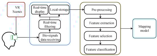 Figure 2 shows a flow diagram of our proposed system to complete the emotion modeling experiment.The VR HMD automatically plays the VR scenes according to the preset experimental paradigm, and the bio-signals of the subjects are recorded simultaneously by HMD Bio Pad. After receiving the recorded bio-signals data on the HCI interface software, the emotion model is constructed through signal pre-processing, feature extraction, feature selection and feature classification.