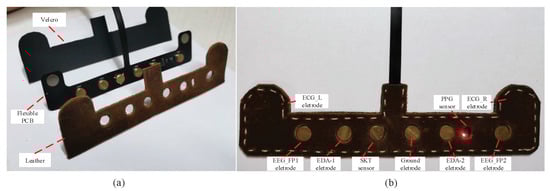 In this section, we give the description of the HMD Bio Pad hardware design. The main goal is to design a wearable device which collects multimodal bio-signals from forehead. The HMD Bio Pad hardware consists of flexible sensor pad and bio-signals acquisition system. They are connected by USB Type-C connector. The structure diagram of flexible sensor pad can be seen in Figure 3a. One side of flexible printed circuit board (PCB) is covered with a breathable, skin-friendly leather material, and the other side is covered using a velcro fastener. The electrodes and sensors are placed on the flexible PCB, which are shown in Figure 3b.