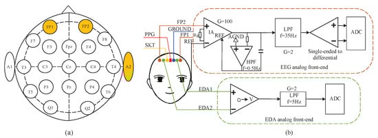 The positions of electrodes and the flowchart of AFE circuit: (a) The positions of electrodes placement according to the 10–20 international EEG standards. (b) The positions of electrodes and sensors, the AFE circuit of EEG and EDA.