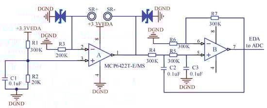Electrodermal activity (EDA) refers to the sympathetic response caused by strong emotional stimulation, which leads to the rapid increase of secretion of sweat glands in a short period of time, that is, the generation of mental sweating []. Mental sweating is the most obvious on the palmar and plantar sites, and can also be found on the back of the hands, forehead, neck, forearms and legs []. In this paper, the EDA electrodes are placed on the forehead, as shown in Figure 4b. The acquisition of EDA converts the change of forehead surface impedance into that of electrical signal. The AFE circuit of EDA is depicted in Figure 5, where and represent two mental electrodes.