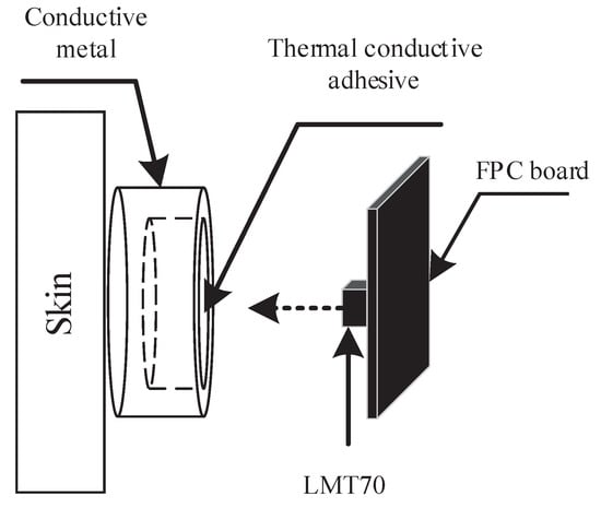 The change of skin temperature is a manifestation of vascular response. There are slight differences in body skin temperature with different emotional states, which can be used for emotion recognition research []. At present, the body temperature measurement sites mainly include oral, rectal, armpit, ear and forehead, etc. In this paper, the integrated temperature sensor is placed at the center of the forehead, as shown in Figure 4b. The integrated contact temperature sensor LMT70 (Texas Instrument, Dallas, TX, USA) with small-size (0.88 mm * 0.8 mm), high-accuracy (20–42 , ±0.05 ) and low-power consumption (9.2 A), which is suitable for wearable devices. The schematic diagram of the temperature sensor structure is shown in Figure 6.