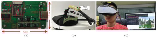 The PCB of bio-signals acquisition system is shown in Figure 7a. The board size is 5.2 cm × 3.2 cm. The main hardware function modules are marked with red line and tested. An example that HMD Bio Pad is assembled in DPVR E3 VR HMD is depicted in Figure 7b. Figure 7c shows HMD Bio Pad worn by the subject who is in VR scene.