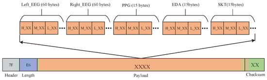 Data visualization interface is mainly used to complete the process of the real-time waveform display of multimodal bio-signals, the communication rate and port number setting, and the data storage. The visualization interface program design mainly includes two threads. One is responsible for data receiving, unpacking, verification, etc, and the other is mainly responsible for waveform drawing. Data receiving module receives bio-signals data from MCU through Bluetooth according to certain data packet format. The data packet format is shown in Figure 8. In this paper, the sampling frequency of EEG is 400 samples per second. Since other peripheral bio-signals are low frequency signal, they are recorded at a sampling frequency of 100 Hz. The data packet consists of 168 bytes including a header byte (0x7F), a payload length byte (0xE6), data payload packet and a CRC checksum byte. After calculation, 20 data packets of 168 bytes each in size need to be transmitted per second. Every 50 ms, a data packet is transmitted to PC. Therefore, the establishment connection time is 50 ms. Bluetooth is in sleep state when there is no data transmission, which can reduce the number of data transmission, thereby reducing the power consumption of Bluetooth.