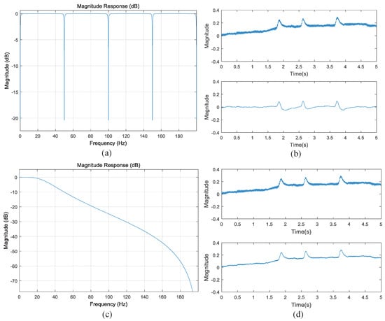 Response of the filter and examples of the filter effect: (a) the frequency response of the comb filter. (b) an example of blinking EEG raw data and the output EEG data with the comb filter. (c) the frequency response of the low-pass filter. (d) an example of blinking EEG raw data and the output EEG data with low-pass filter.