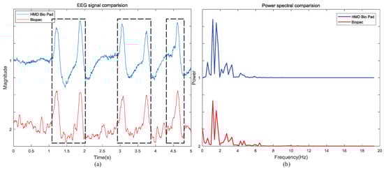 In this paper, EEG signals in the FP1 area are recorded simultaneously by HMD Bio Pad and the EEG module of Biopac, USA. The correlation between the EEG signal collected by the two devices with mental dry electrodes is observed after normalization. In Figure 11a, the pulse signal encircles by black dotted line corresponds to the eyes blink, which indicates that the EEG signals collected by the two devices have a strong consistency and prove the effectiveness of HMD Bio Pad. Meanwhile, the power spectral density also indicates that the two systems have the same spectral components in Figure 11b. The Pearson correlation coefficient between the power spectral density of both EEG signal is 0.945, which indicates a strong linear positive correlation between these two signals. The above results demonstrate that the proposed EEG acquisition system can achieve the comparable signal quality in comparison with the dedicated bio-signals measuring device. While in FP1 area, although the recorded EEG signal has high similarity, most of EEG signal is drowned by eyes blink. This may not be very persuasive for EEG measurement. To further verify the performance of HMD Bio Pad in EEG measurement, an eyes-open and eyes-closed task was performed.