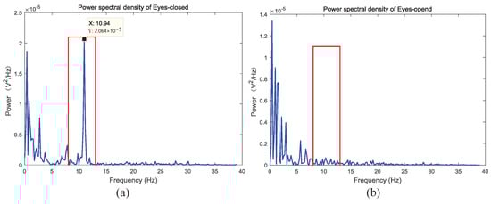 An example of eyes-open and eyes-closed task: (a) EEG power spectral density of eyes-open. (b) EEG power spectral density of eyes-closed.