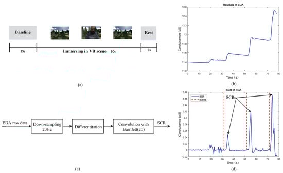 The skin conductance response (SCR) in EDA signal is considered to be a vital feature because it responds to the internal response of the human body to external stimulus. In this paper, the virtual scene is used as the stimulus source to observe the SCR after stimulation for verifying the performance of the EDA acquisition system. According to the instructions of the experiment instructor, the subjects firstly wore HMD Bio Pad and then recorded baseline EDA data for 20 s in a quiet room with temperature of 25 . Then subjects were immersed in the virtual village scene for 60 s. During the process of scene playing, stimulus events would appear regularly in the scene. The experimental paradigm and scene are shown in Figure 13a. The EDA signal recorded in the experiment is shown in Figure 13b. In this paper, the SCR extraction method mentioned in literature [,] is used to extract SCR from the EDA signal. The process of calculating SCR is shown in Figure 13c. The EDA raw data is first sampled down to 20 Hz, then differentiated, and the differentiated signal is convolved with the 20 points Barlett window. The SCR signal is shown in Figure 13d, and the red dotted line represents the moment when the triggering event occurs. It can be seen from the figure that the SCR occurs after a few seconds of the stimulus event, which is consistent with the conditions of SCR generation described in literature []. This indicates that the EDA acquisition system can correctly collect EDA signal and extract SCR signal related to stimulus response from EDA signal, which verifies the feasibility of the EDA acquisition system.