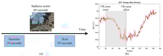 As mentioned above, we use a contact temperature sensor (LMT70) for skin temperature (SKT) acquisition. Numerous studies have showed that unpleasant emotions like sadness, fear, anxiety may cause the decreasing of SKT temperature [,]. In order to validate the performance of SKT acquisition system, we designed a experimental to observe SKT of subjects who immersed in the sadness VR scene. The experimental paradigm is designed according to the literature [] and showed in Figure 14a. The subjects firstly wore HMD Bio Pad and then waited a few seconds until the temperature stabilized in a quiet room with room temperature of 25 . Next, we recorded 20 s baseline data, 60 s immersing in sadness VR scene data, followed by 90 s resting data allowing the thermal response to build up.